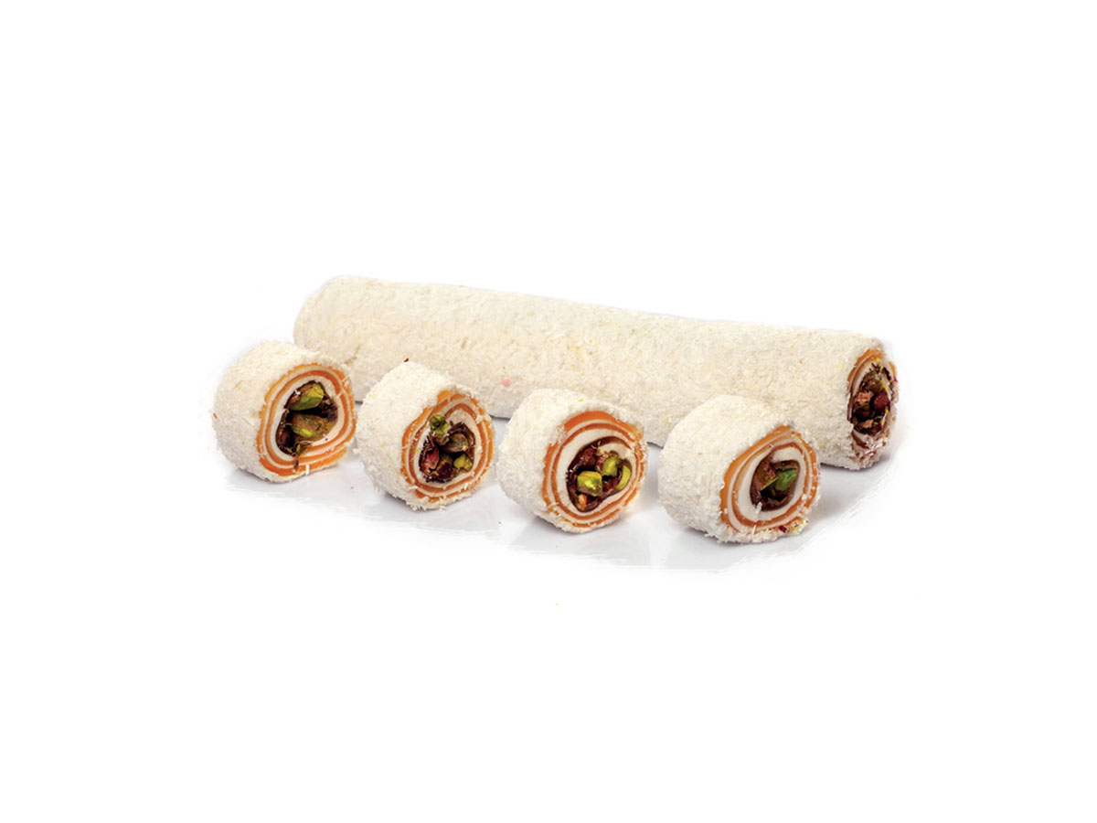 Gourmet Roll Delight With Pistachio & Pomegranate Flavor Coated With Coconut